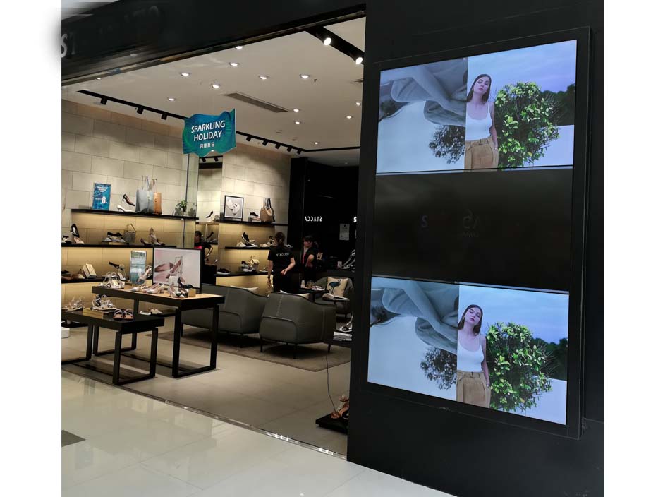 門店門口處,安裝拼接大屏或者掛式廣告機,用于展示門店新品、模特服裝造型,吸引過往人群,同時提高門店形象。
